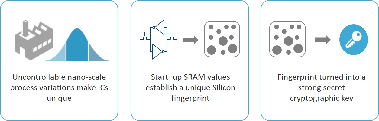 - SRAM PUFs create the fundamental device root key upon which all security scenarios are built and from which all additionally required keys are derived