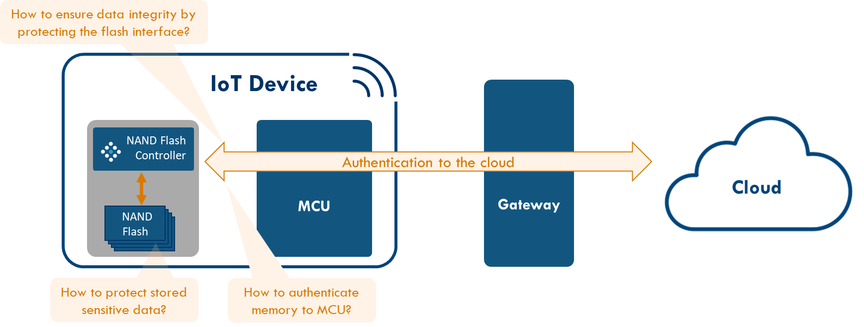 The cryptographic keys remain inside the processor, never leaving the boundaries of the controller, and become the basis of security. Having these strong cryptographic keys inside the NAND flash controller protects the flash content and its interfaces, while being able to authenticate the managed NAND to the MCU and even adding the unclonable device identity that is the foundation for cloud services to securely authenticate the IoT device and setup secure communications. Hence, a standard managed NAND flash is turned into the valuable foundation for system-level security of an IoT device.